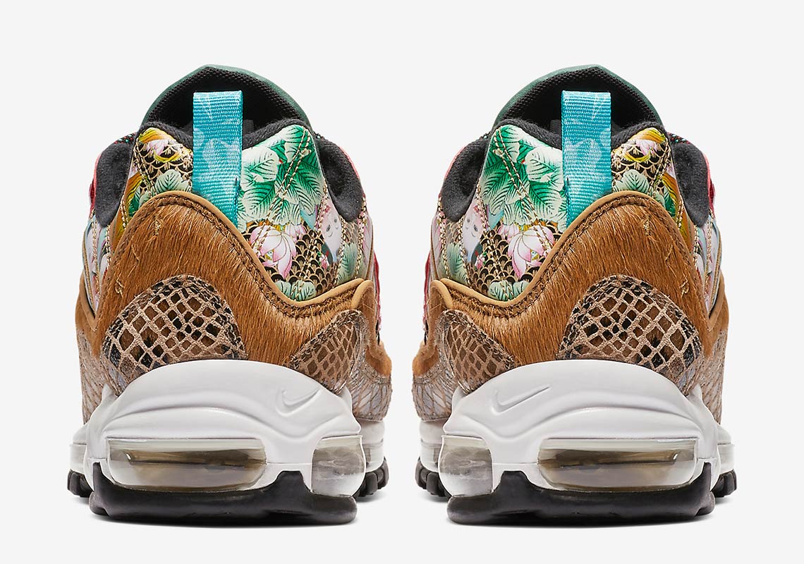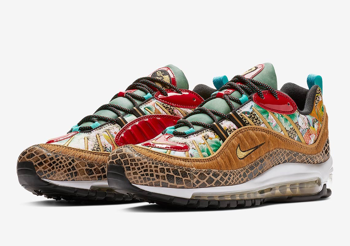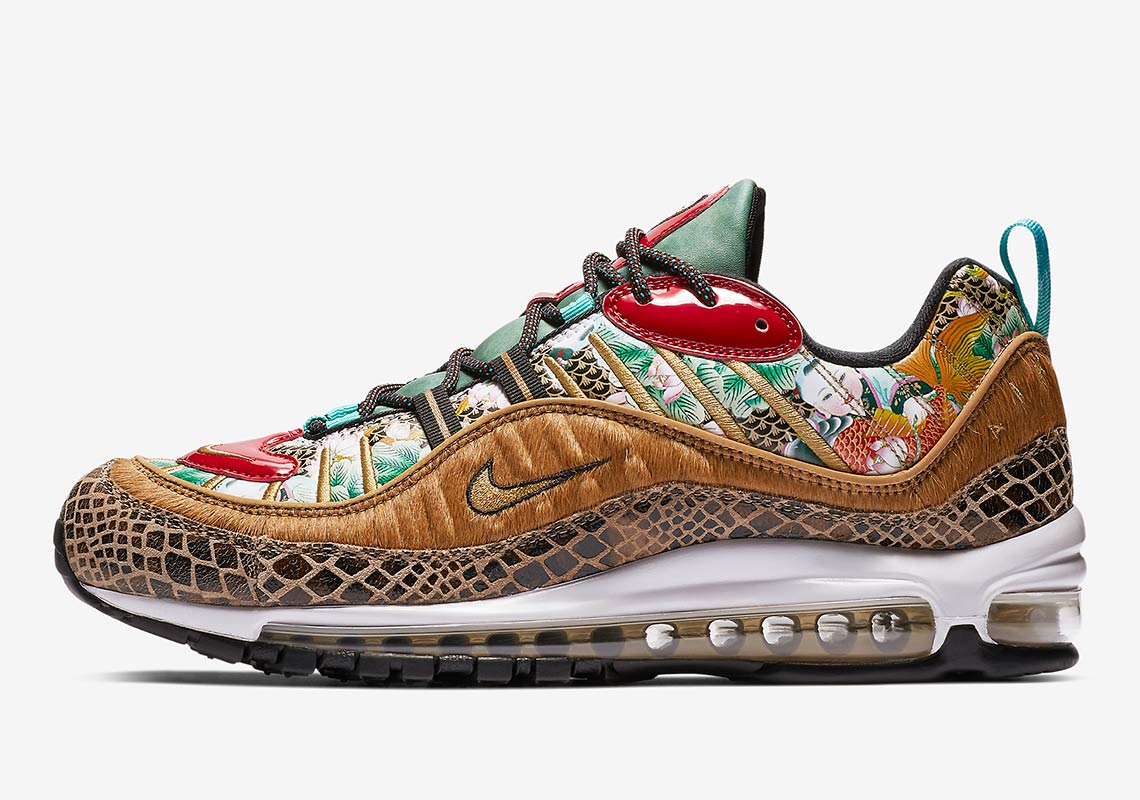 In honor of the Chinese New Year Nike will be releasing a very cool and colorful Nike Air Max 98. The shoe will feature the traditional Bai Jia Yi quilted pattern in teal, red, gild and six different materials ranging from snakeskin to patent leather. You can check out the official images above and Nike Air Max 98 Chinese New Year Edition makes this a must have in the young 2019 year. Mark your calendar for January 2019 and you can pick it up via Nike.com.
