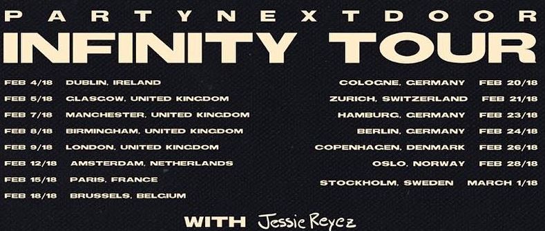 PARTYNEXTDOOR was on the news this weekend due to some legal issues. That’s still not stopping the OVO affiliate from announcing his new ‘Infinity World Tour’ along with Jessie Reyez. Mostly an European tour and kicks off at the top of the year in February 2018 in Dublin. Check out the poster below, and tickets go on sale this Friday, October 13. Check out the tour dates below.